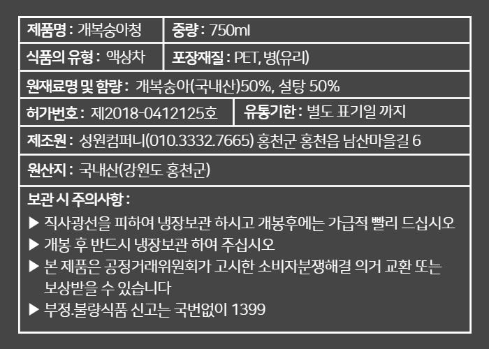 성원컴퍼니 홍천농산물 홍천 개복숭아청 액기스 원액